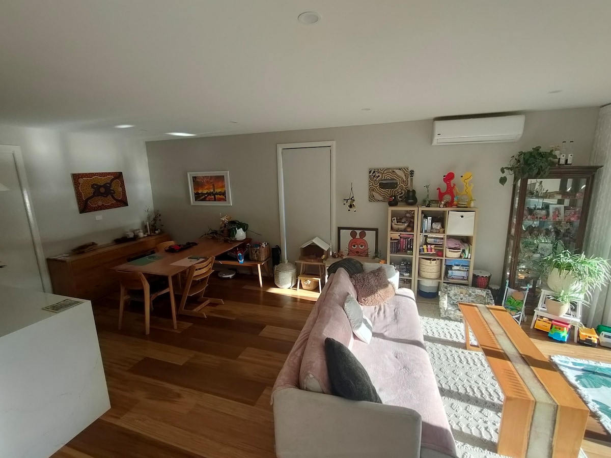 Espacio suficiente para toda la familia. Uso exclusivo de la casa en el último piso y un enorme patio trasero. Apto para sillas de ruedas con 3 generosas habitaciones y una gran sala de estar luminosa. Mantén el calor en las noches frías con la chimenea de leña contenida. Patio trasero completamente vallado con árboles frutales y una fogata para brindar en esas noches frías. malvaviscos. A poca distancia de las tiendas Ngunnawal (supermercado Spar, farmacia, comida para llevar y panadería). * La puerta de al lado está en desarrollo. Puede ser ruidoso durante el día.