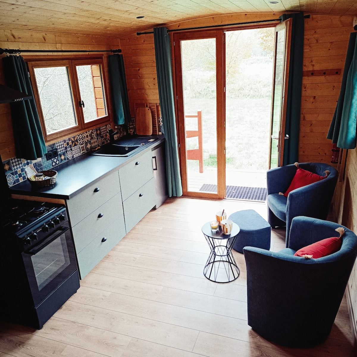 Caravana de los setenta renovada en un estilo romántico en más de 500 M2 para su uso exclusivo para mayor privacidad. En la terraza de madera un jacuzzi de agua deliciosamente perfumado. Un espacio brasero con todo lo necesario para una velada chamallow fundida bajo las estrellas. Sanitarios en el espíritu de la cabaña inusual en la ubicación. Por la mañana, se sirve un abundante desayuno en la terraza. Agua sin gas/con gas/refrescos en el minibar para calmar la sed.