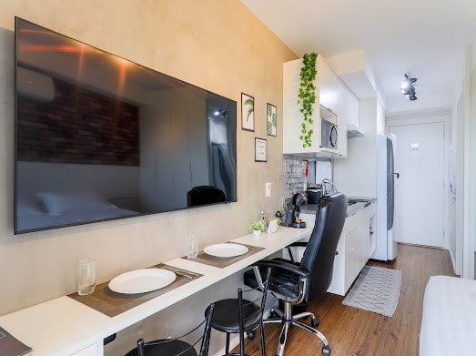 Estudio de lujo en la calle Oscar Freire Moderno, sofisticado y completo, en la calle más famosa de São Paulo por las tiendas de lujo. Estudio en el piso 24, de frente, con magníficas vistas a la Av Paulista. Bien equipado, con TV de 55 pulgadas, Wifi Internet Vivo Fibra 200, TV por cable, Aire Acondicionado silencioso, Cafetera, Cocina y Minibar, Cortina black-out automatizada, Plancha portátil, Utensilios de cocina, Secador de pelo, Sábanas y Toallas suaves, jabón y kit de champú/acondicionador.