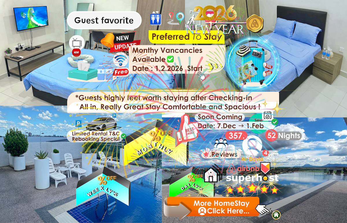Forget worries in this spacious and serene space of muji style home stay at 12 level. ✅Unique & beautiful high sky, sunset, city view & peacefully quiet place. ✅Handpicked most comfortable bed no other homestay could provide. ✅Relaxation fun stay. ✅10 minutes drive to town. ✅15 minutes drive vivacit ❗Please inquiry for Parking lot if you need one as we have limited quota per month. For security purposes. A photo of your identity card is required.