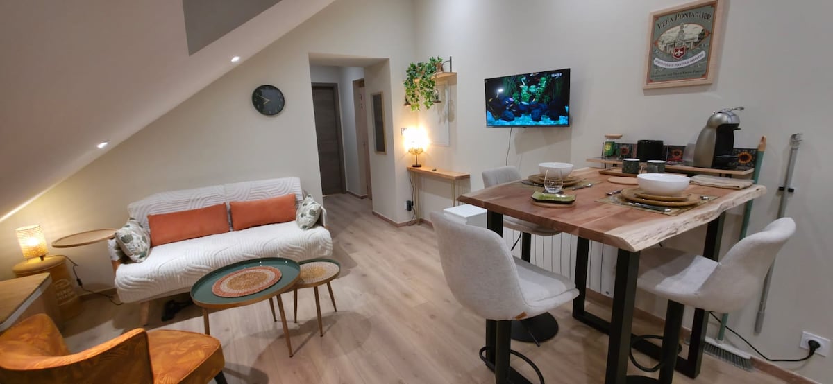 Idéal Frontaliers Suisse (à 2 Km de la douane Suisse de Vallorbe). Bienvenue chez "Les Dodos d'Or", à "La Fée Verte", un appartement cosy de 27 m² inspiré de la légendaire Fée Verte du Jura. Parfait pour une escapade romantique ou un pied-à-terre pratique aux portes de la Suisse, avec une vue dégagée sur la forêt et une déco soignée autour de l’Absinthe. Parking privé, garage partagé gratuit, avec portes électriques