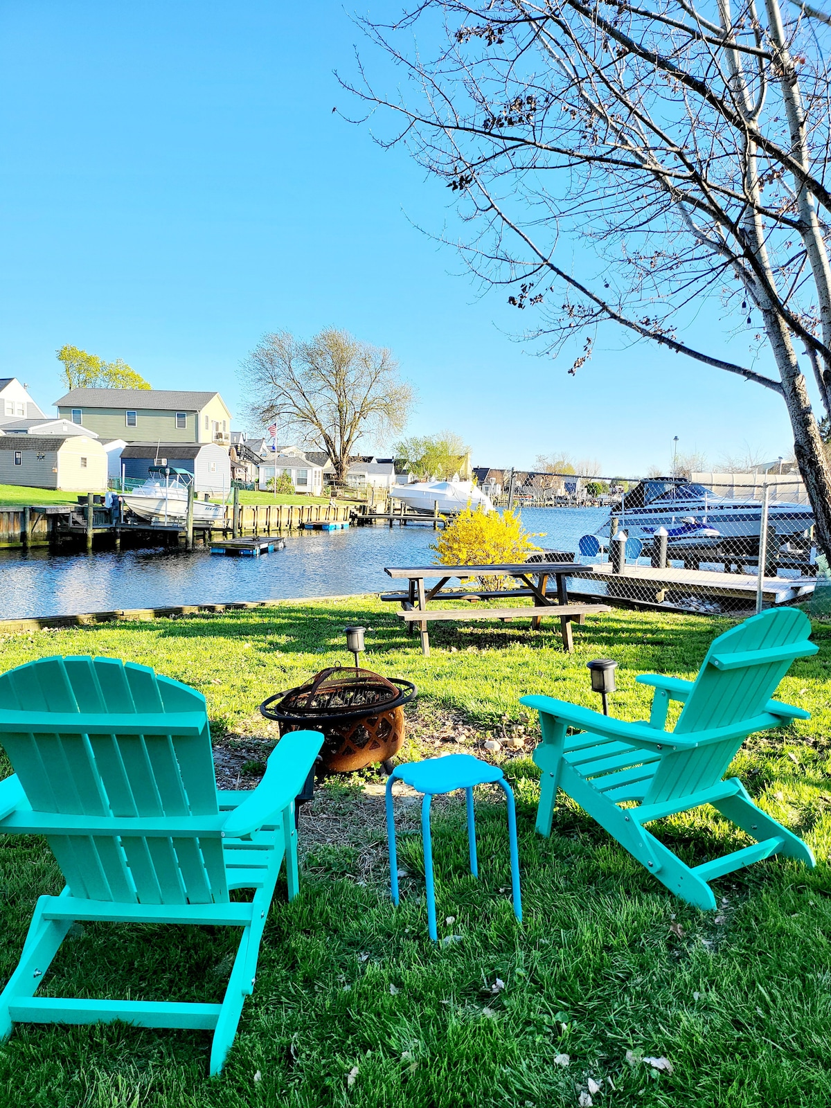 Te encantará este lugar debido a la bañera de hidromasaje gigante de 64 chorros, la cocina totalmente equipada, el teatro, las vistas dobles frente al agua, muchos asientos al aire libre, la comodidad, la gran cantidad de juegos grupales y las cómodas camas. Pesca en el patio trasero, parrilla, fogata y enorme bañera independiente. A pocos minutos de tiendas de comestibles, restaurantes, el puerto deportivo principal, el Sparrow Point Country Club y el Bayfront Club para eventos.