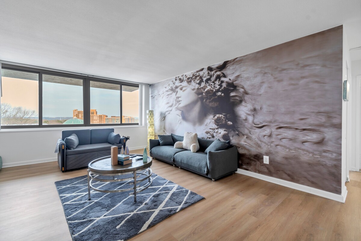¡Te damos la bienvenida a tu santuario artístico! Este apartamento de 2 camas combina sin esfuerzo creatividad y comodidad. Disfruta de acogedoras noches de películas con Netflix en una pantalla grande o da rienda suelta a tu superestrella interior con el sistema de karaoke. Mantente conectado con internet rápido durante toda tu estadía, ideal para trabajar a distancia o transmitir tus programas favoritos. Tendrás un permiso de estacionamiento exclusivo para vehículos. Otras comodidades para disfrutar son PlayStation, ¿Sonos? Altavoz Alexa. Ven a proporcionarte un ambiente inspirador para la relajación.