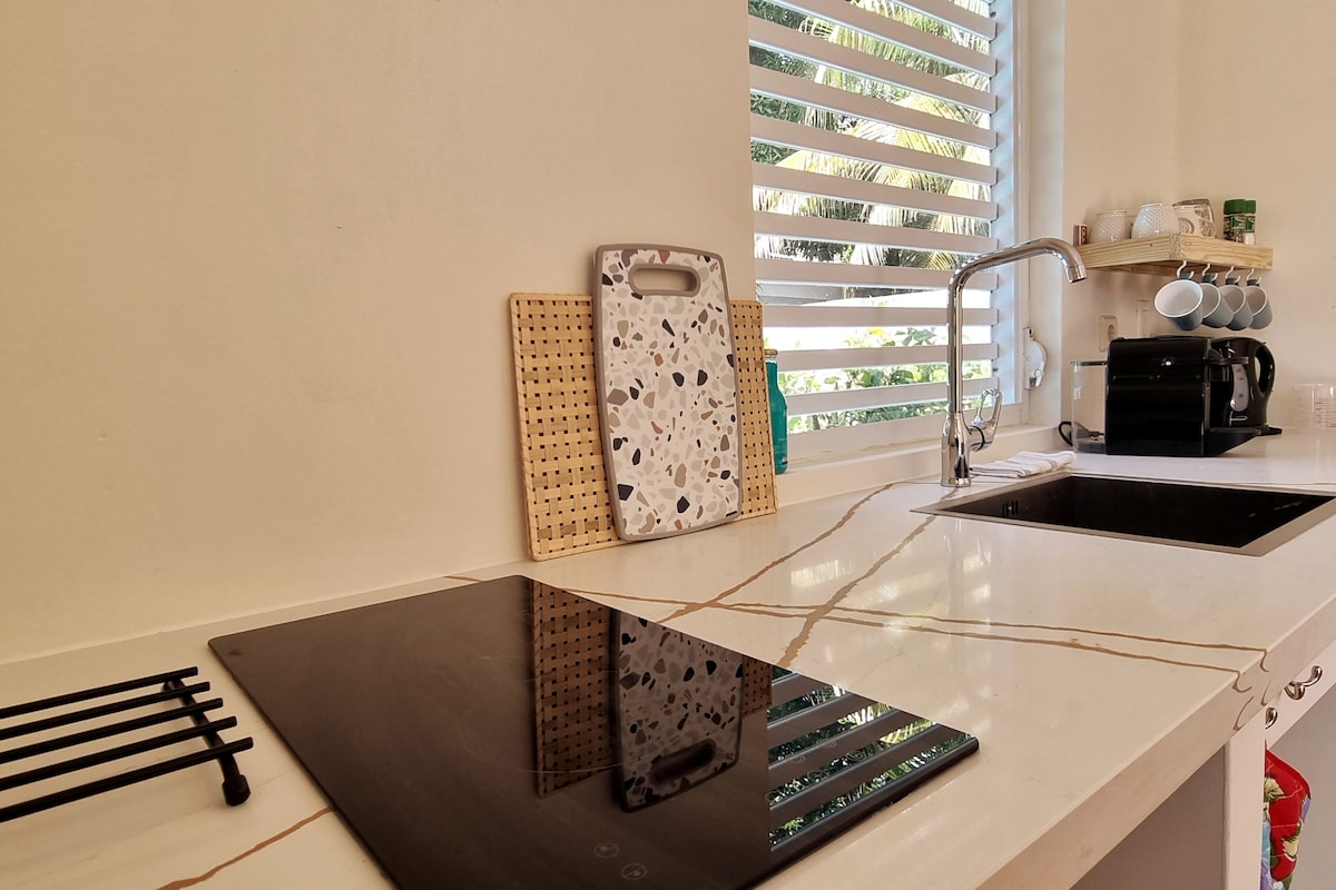 Amplio apartamento moderno en una ubicación privilegiada, disfruta de un corto paseo de 7 minutos a la hermosa playa, bares y restaurantes. El apartamento es totalmente privado con entrada propia, sala de estar, baño, dormitorio con aire acondicionado, cocina y balcón. El apartamento está equipado con una nueva cama cómoda y un lujoso sofá (cama). El balcón y el jardín te invitan a sentarte, darte un baño o tomar una copa de vino mientras ves tu serie favorita de Netflix en el televisor LED inteligente de la sala de estar.