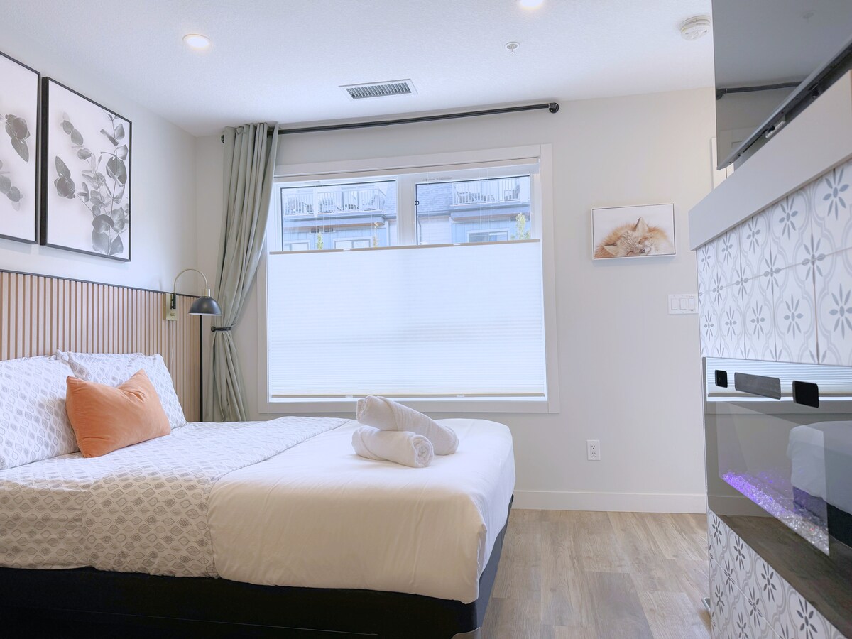 Welcome to your luxurious mountain retreat! This brand-new one-bedroom king suite accommodates up to 4 guests. Just a 10-minute walk from the town center, the suite features a king-sized bed, a pull-out sofa bed, one bathroom, a fully equipped modern kitchen, flat-screen TVs, a washer/dryer, and luxurious linens and towels. The suite includes access to a hot tub, gym, and one underground parking space. Short-term rental license: RES-09776