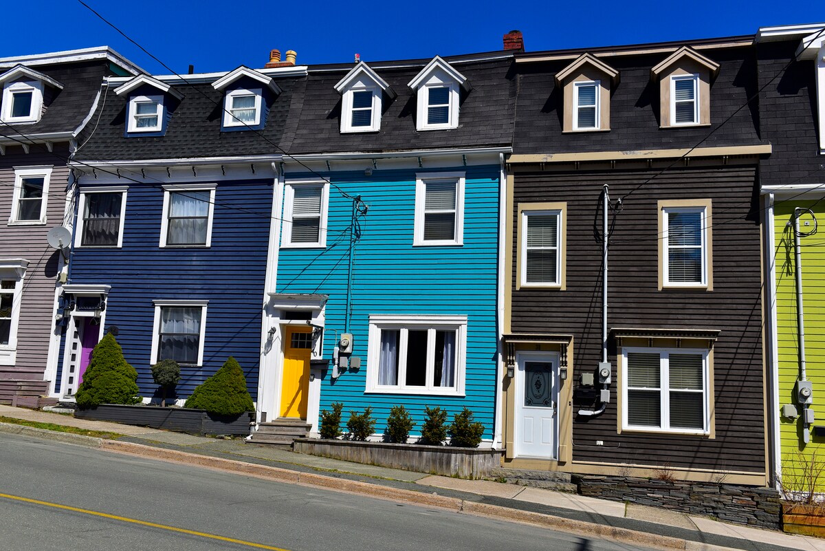 Welcome to 24 Colonial Street! Original 1916 restored, fully renovated Jelly Bean Row house in downtown St. John's, walking distance to all sites. The Perfect location! 3 Bedrooms all with ensuite bathrooms & with very comfortable queen beds, 2 sitting rooms off the queens 1 with 3 twins, 2nd with 2 twins. All with duvets. Perfect for larger groups up to 11 people or 2 families with kids or 3 couples! Bannerman Park, Colonial Building, Govt. House, Signal Hill. On street free parking.
