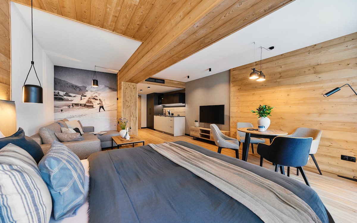 Casa de refugio estudio con una superficie de 33 metros cuadrados con balcón en un dormitorio extendido, con una hermosa vista a los Tatras occidentales. Espacioso interior de 4 metros terminado con madera de alerce. Una cama tamaño king de 180x200 cm con 2 camas individuales Cocina pequeña con lavavajillas, nevera, microondas, tostadora y cafetera. Un sillón extensible de 100 cm de ancho hace que el estudio sea cómodo para 2 o 2 personas con un niño. Baño abierto, inodoro con lavabo en habitación independiente.