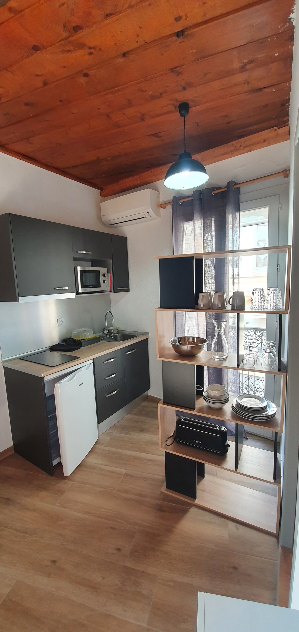Estudio de 23 m en el primer piso en pleno centro de la ciudad, cerca de todos los comercios y la playa. Una habitación principal con aire acondicionado con: -2 balcones - Cocina equipada (nevera, vitrocerámica, microondas, campana extractora, cafetera de filtro...). - Lado salón/dormitorio (sofá sistema BZ con buen colchón de 140x190), un vestidor con armario y estantes, un aparador con 3 cajones, mesa de centro, un pequeño televisor, wifi. - Un cuarto de baño con ducha e inodoro - Se proporcionan sábanas y toallas