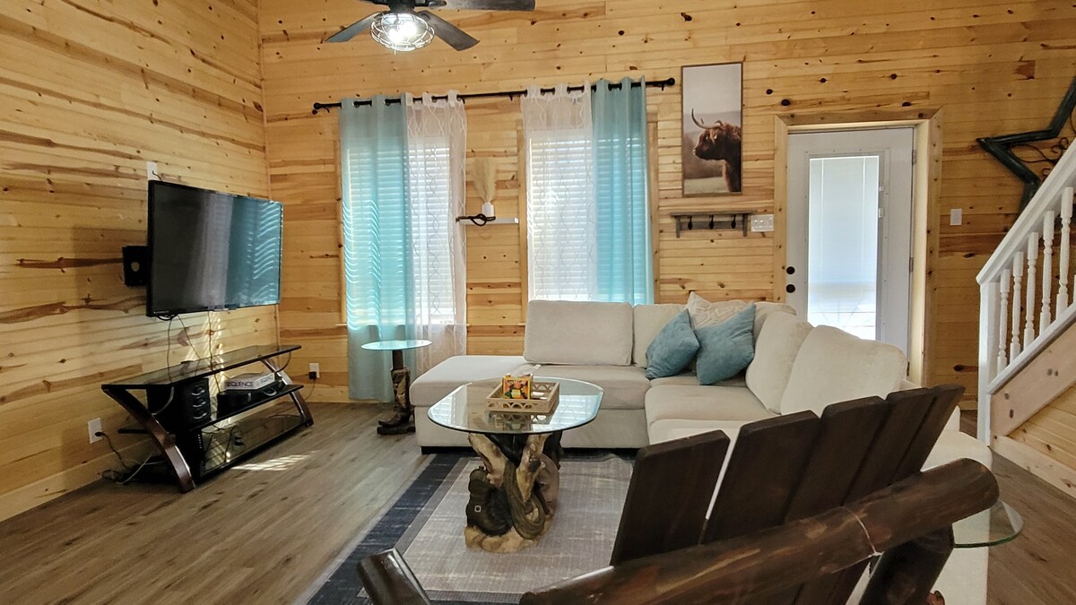 Trail of Faith Ranch is an actual working ranch nestled in the country. The Bunkhouse offers two bedrooms with queen beds, bath, full kitchen, a front porch, firepit, fishing, and simple relaxing right next to pastures of Texas Longhorn cattle, roosters crowing, donkeys, goats, and more. Country setting offers quiet walks and night skies filled with stars and fireflies. A short drive takes you to our market, shopping, eateries, and theatres, or just cozy-up, and relax in the country.