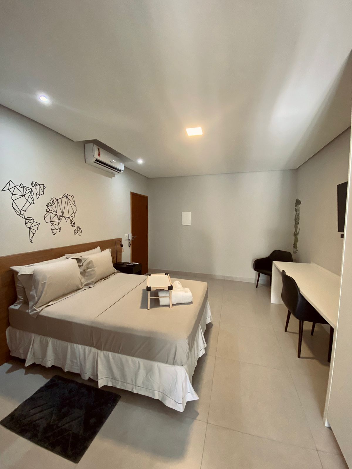 Nuestro estudio tiene 46 m² (495 pies cuadrados) y está ubicado en una zona privilegiada de Bauru. Está cerca de supermercados, panaderías, bares y restaurantes, así como de Centrinho/Usp, CPO y FACOP. Es un espacio moderno y acogedor, lleno de estilo, comodidad y aire acondicionado. Seguro que tu reservación no traerá un alojamiento sencillo, sino una experiencia maravillosa y notable. El edificio cuenta con recepción las 24 horas, gimnasio, espacio de coworking, piscina y lavandería.