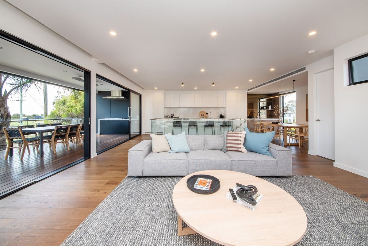 This stylish place to stay is perfect for families. Big entertainer, multiple living zones, pool, spa and sauna. Set in lush gardens with bbq and table tennis under covered patio perfect for the family holiday. Doors to Rickets point beach & Donald MacDonald Reserve oval/playground. Walk to concourse and Black Rock Village, Bus Connection 9min to Sandringham train station.