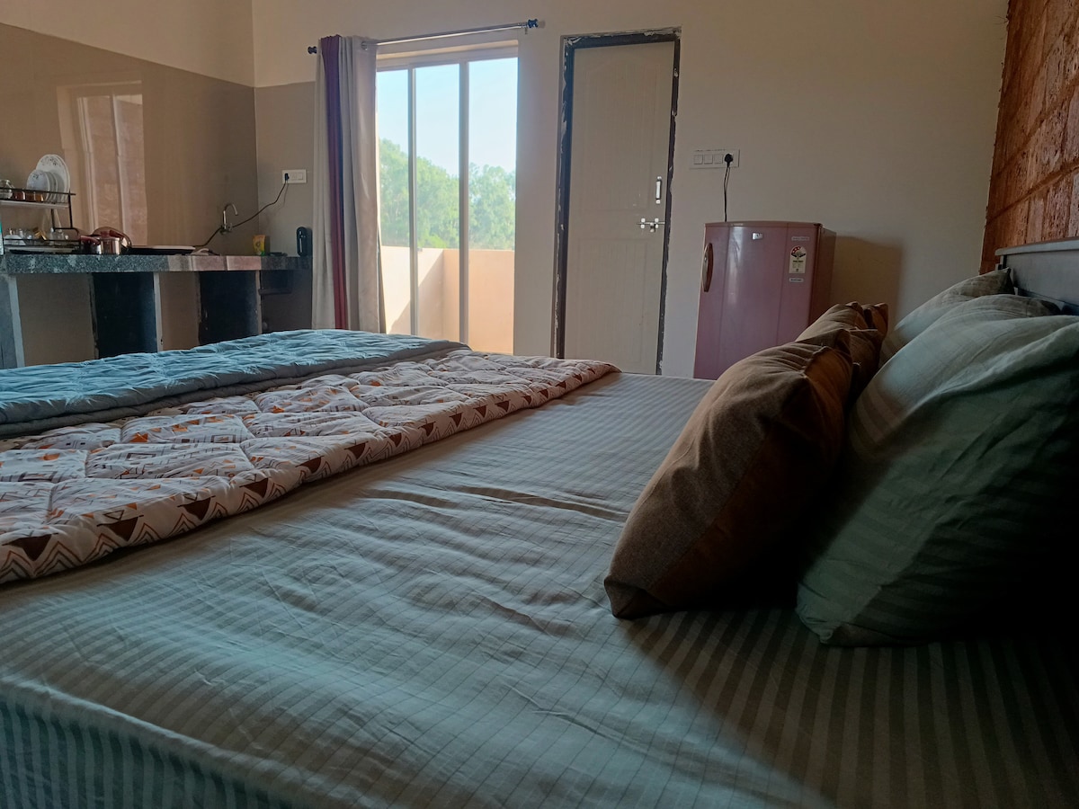 Visita Raje Farms, una escapada especial donde la belleza del estilo Wada Maharashtrian se encuentra con el cálido encanto del diseño de Kerala. Cada habitación está adornada con lujosa ropa de cama de estilo hotelero, colchas suaves y cojines lujosos, lo que garantiza que disfrutes de una noche de sueño reparador en completa paz. Para aquellos que buscan relajación en medio de una exuberante vegetación, nuestro amplio césped te espera, con cómodos asientos de macha que te invita a relajarte, descansar y disfrutar de la naturaleza con la máxima comodidad.