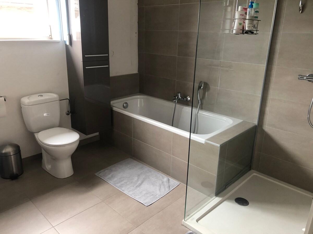 ¡Disfruta de este fabuloso alojamiento en familia! Esta casa tiene un dormitorio grande con cama doble grande, otro dormitorio grande con literas, un dormitorio pequeño con cama doble y uno con cama doble/litera/baño. ¡Hay una gran sala de estar con una hermosa mesa de billar! Una cocina equipada y 2 baños. También hay 3 aseos, una terraza y un pequeño jardín. También tienes un garaje cerrado con electricidad y un garaje exterior.