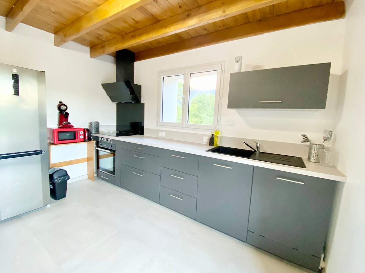 Venga a relajarse en este lugar tranquilo, nuevo y luminoso, de una sola planta, en la planta baja de mi casa: entrada independiente, cancha de petanca. Garaje para bicicletas. La zona de cocina está equipada en el garaje, se puede comer en la habitación de al lado o en la terraza. Estaré encantado de informarle: senderismo, natación (lago, ríos, piscina en julio-agosto), vía ferrata, restaurantes, tiendas, médico. A 10 minutos a pie del centro del pueblo, hay mercado todos los lunes por la mañana.