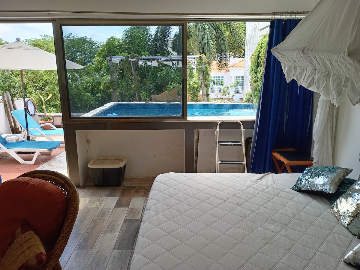 Ideal para parejas. La habitación forma parte de un pequeño condominio frente al mar abierto. La playa más cercana está a 10 min caminando. Lugares de interés: Al lado de la terminal de ferrys Ultramar y al frente de Isla Mujeres. La habitación tiene baño privado y entrada independiente desde áreas comunes. Esta habitación no cuenta con estacionamiento, sin embargo, puedes consultar por la disponibilidad de un espacio, es importante hacerlo con antelación.