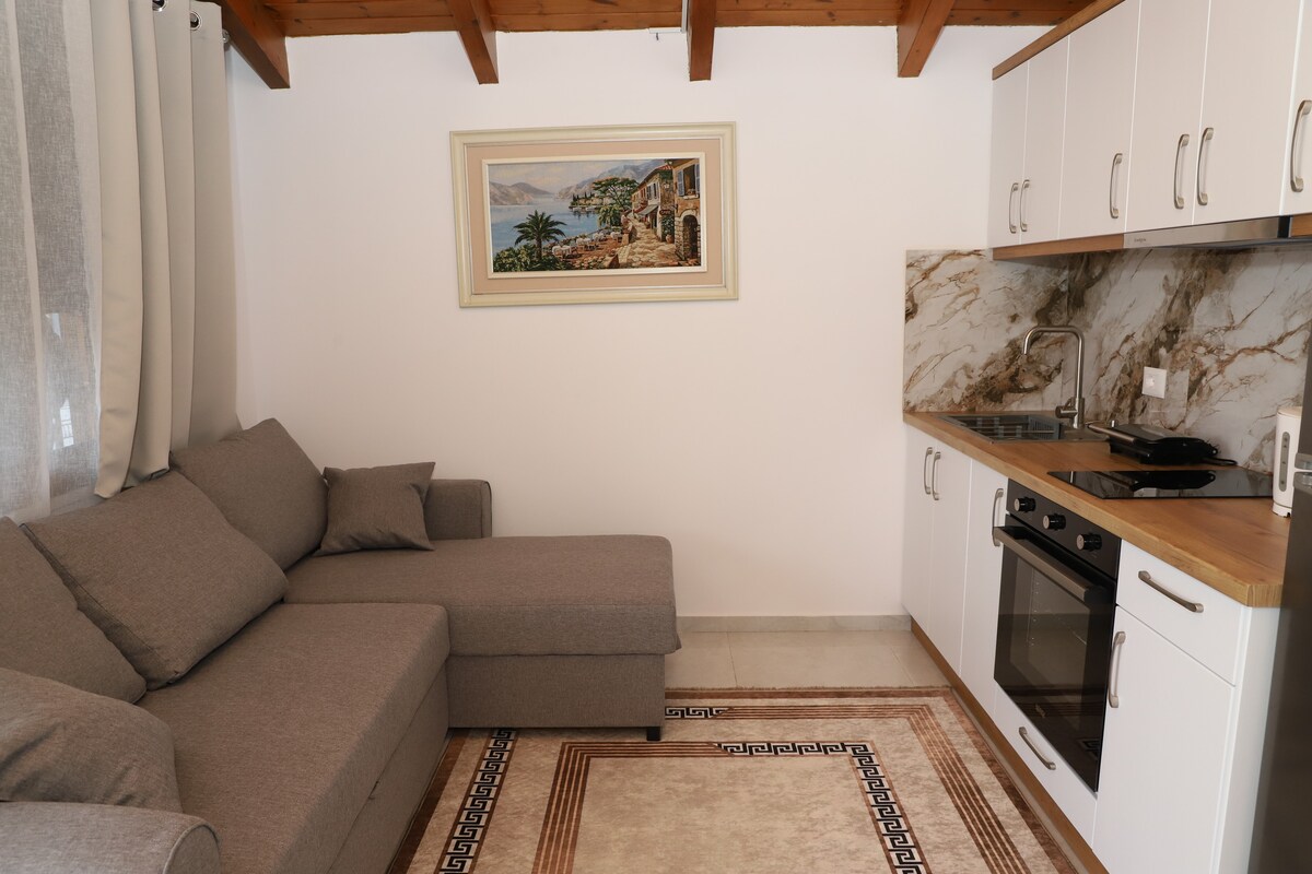 Studio 1 is part of Villa Kince, which features two identical studios. Each studio includes a comfortable bedroom with a choice of one double bed or two single beds, a cozy living area with a sofa bed, and a fully equipped kitchen. The private balcony offers stunning views of the mountains, Berat Castle, and the surrounding landscape, creating the perfect setting for a relaxing stay.