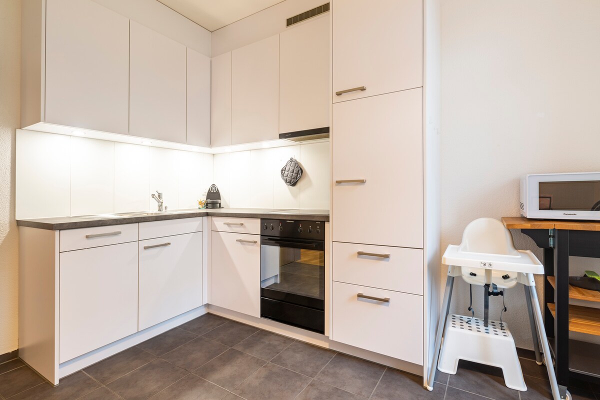 Cómodo apartamento de 2 habitaciones con mucho ambiente y unas vistas fenomenales de los Alpes. A unos 10 minutos a pie de la estación de tren. El centro de Berna está a 15 minutos en tren. Hermosa zona de recreo justo en la puerta de la casa. Un paraíso para paseantes, corredores, ciclistas, nadadores o patinadores. El apartamento está en el ático con acceso por ascensor. Aparcamiento en la puerta. Los anfitriones viven en la casa y están encantados de ayudar y aconsejar.