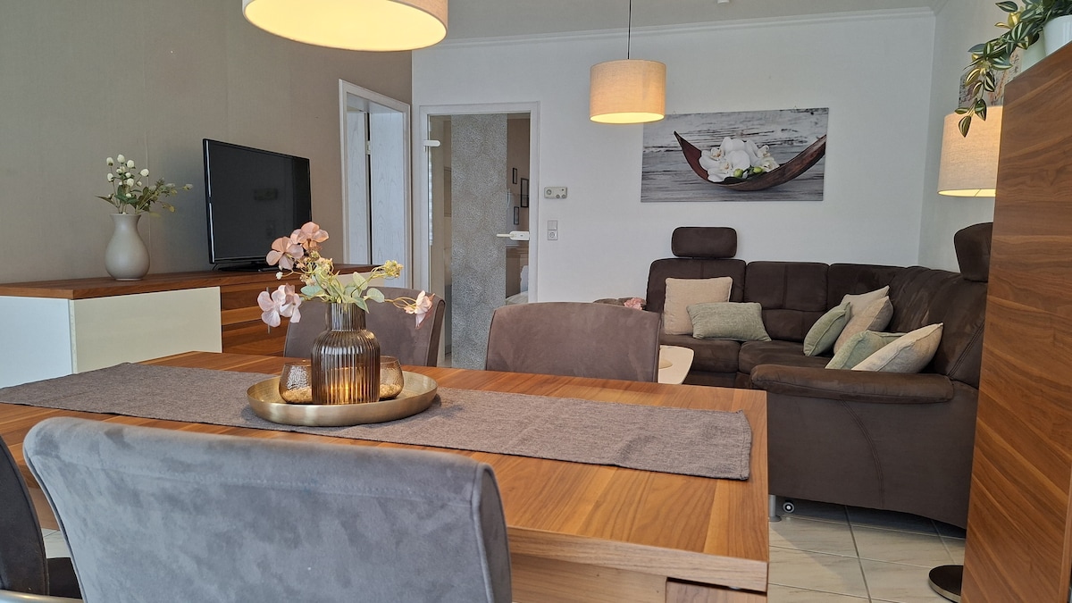 Nuestro moderno apartamento de vacaciones de 55 m² tiene capacidad para 2 personas y está situado en el centro de Mülheim an der Mosel. En el lugar todo es fácilmente accesible a pie. El apartamento consta de: -una acogedora sala de estar -una cocina americana totalmente equipada. -varias cafeteras -Microondas y nevera-congelador -un amplio comedor y un dormitorio separado. Equipamiento del cuarto de baño: -Ducha/inodoro -Secador de pelo -Lavadora El precio incluye ropa de cama y toallas.