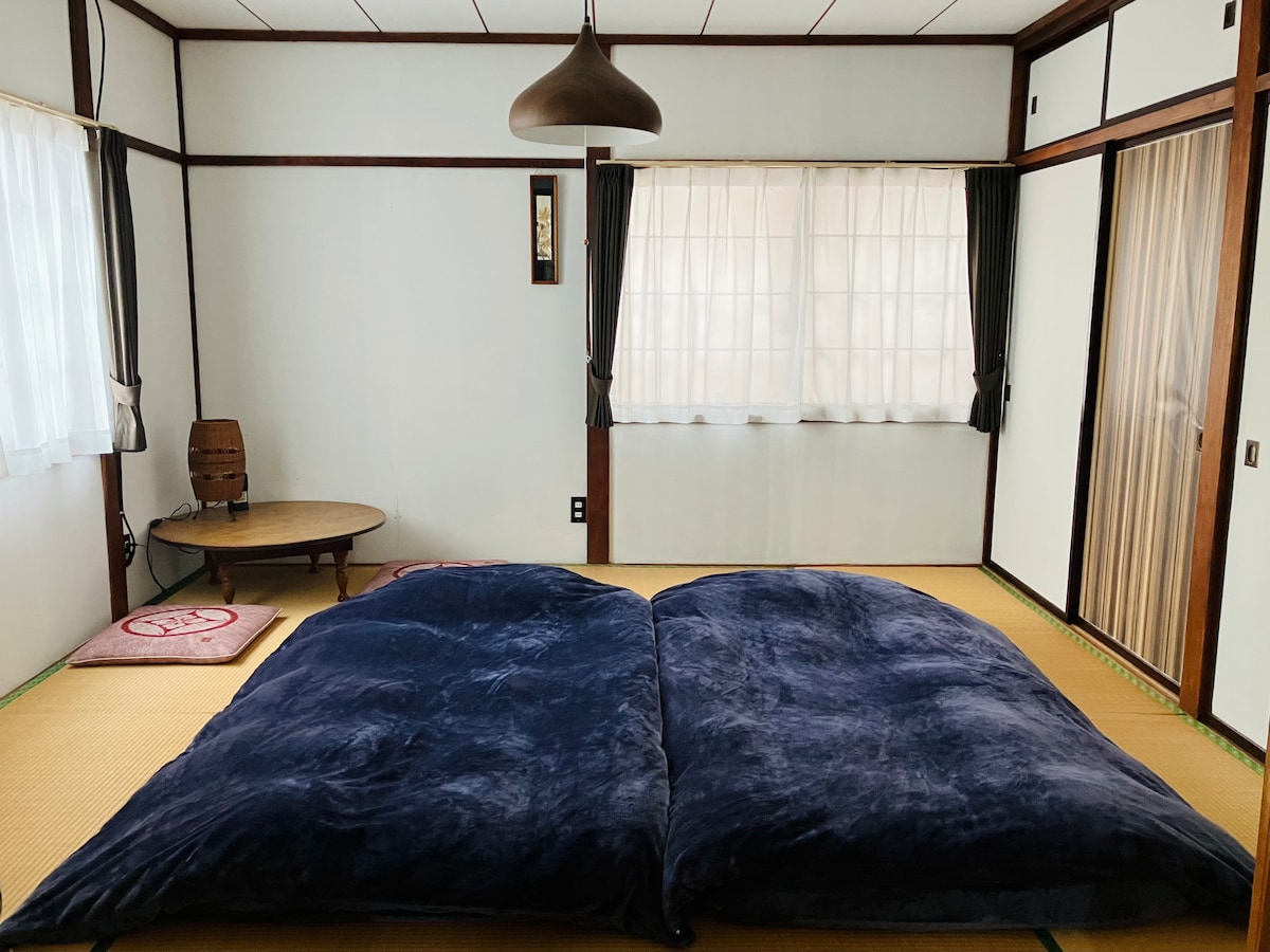 北海道美唄市の古民家で、1階完全貸切のプライベートステイを満喫できます。 美唄駅から徒歩12分。ご家族やグループでの宿泊にピッタリです!1日1組のご宿泊となります。 ダブルベッド1台、折りたたみ式シングルベッド1台、布団が5組あり、宿泊室が3部屋あります。お布団の必要のない小さなお子様は1名追加可能です(最大8名まで宿泊できます)。 車でお越しの場合、高速道路のご利用でJR札幌駅から約1時間、旭川駅から車で約1時間10分。美唄富良野線を利用なら車やバイクで1時間半程で富良野市内に行くことが出来ます(冬期通行止め)。 市内には美唄国設スキー場や、ピパの湯ゆ〜りん館(温泉施設)もあり、炭鉱跡地やダムの紅葉も見所です。春は東明公園の桜も有名です。 スノーランドまでは車で12分です。現地まで美唄駅からシャトルバスでの往復も可能です。 建物のすぐ裏には遊歩道があり、噴水も2箇所、休憩できる東屋や公園遊具もありますので、お子様連れも歓迎です。 ※古民家のため、古いデザインや造り、仕様になっています。それらが苦手な方はご不便を感じるかもしれません。