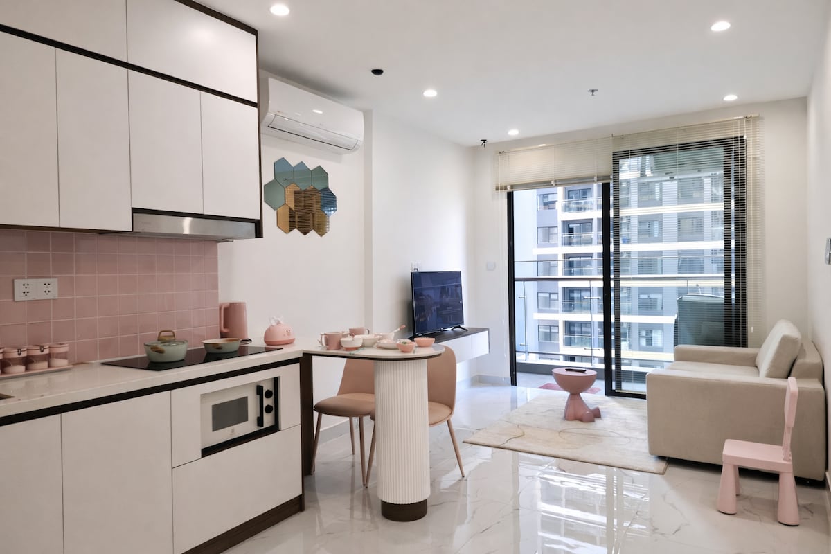 Apartamento de un dormitorio – Origami, Vinhomes Grand Park (vistas a la piscina) Disfruta de una estancia cómoda en un apartamento de 1 dormitorio, con un diseño moderno y sofisticado y un espacio de vida óptimo. Sala de estar luminosa con sofá, TV y entretenimiento en línea. Cocina privada totalmente equipada (nevera, fogones, hervidor de agua, mesa de comedor) para una comida acogedora. Dormitorio separado con cama mullida, grandes puertas de cristal y amplio balcón con vistas a la piscina, ideal para relajarse.