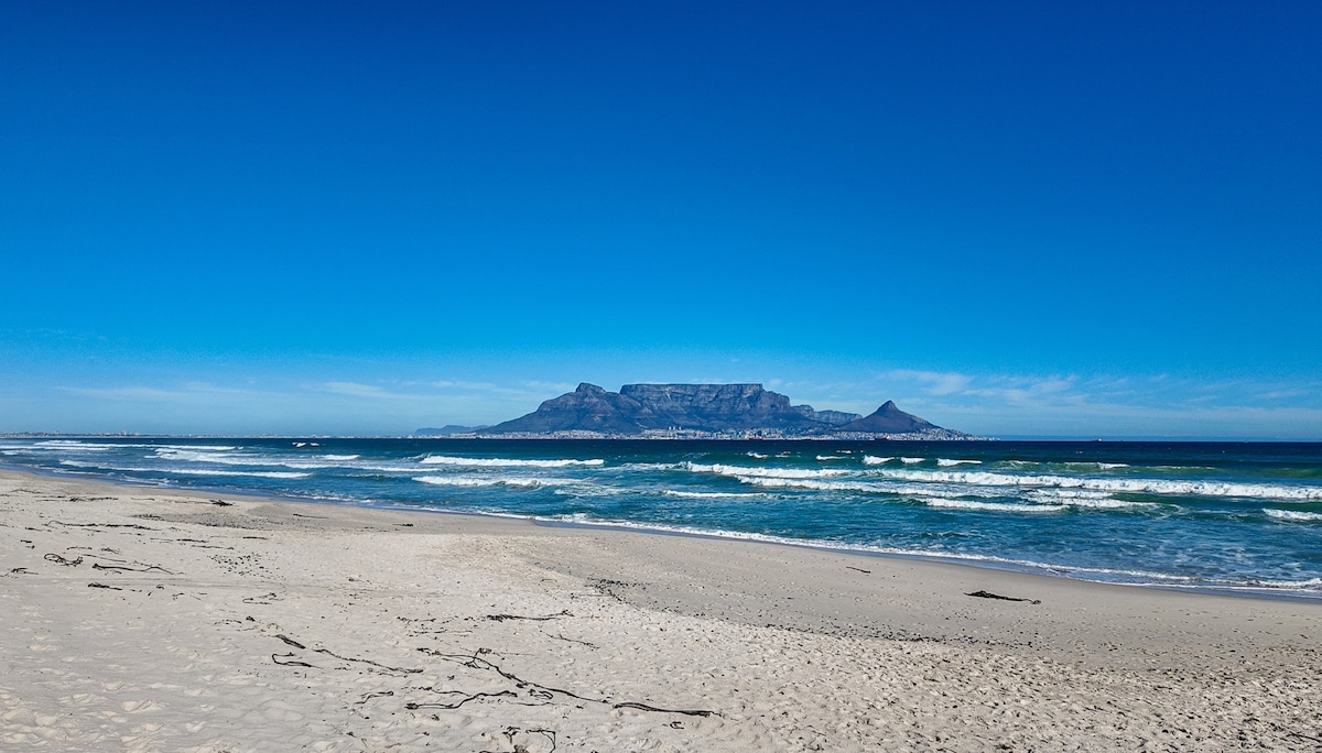 Impresionantes vistas al mar, a la montaña de la Mesa y a la isla Robben desde este apartamento con jardín situado en primera línea de playa de Blouberg. Este apartamento es seguro, ideal para aquellos que quieran relajarse y poner los pies en alto, ¡disfrutar de una barbacoa/braai y una copa de vino en el jardín privado con acceso directo a la playa! ¡Wifi ininterrumpido durante los cortes de energía! Gran escapada para parejas o clientes de negocios o aquellos que disfrutan del aire libre, ciclismo, kitesurf o pasear por la playa.