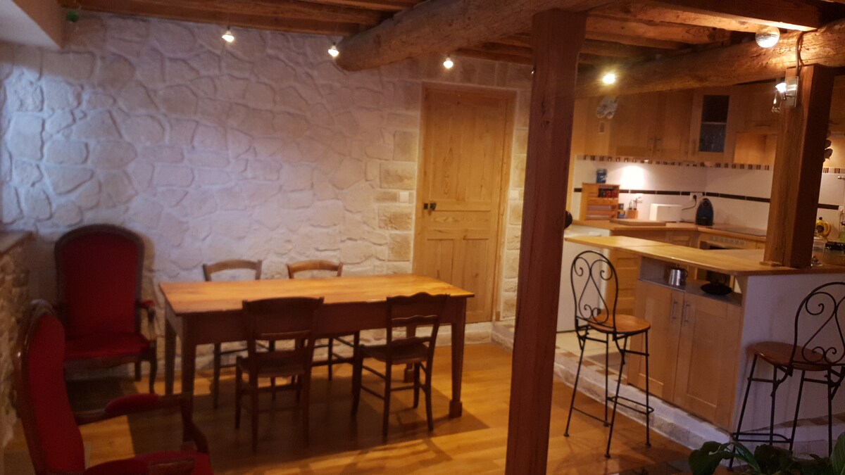 Petit appartement situé au rez de chaussée de notre maison, totalement indépendant, composé d'une grande pièce lumineuse avec un canapé convertible 2 places , un coin cuisine, une chambre de 14 m2 avec 1 lit double et 1 lit simple dans laquelle je peux rajouter un lit bébé, une salle de bain et un wc indépendant. Il est possible de profiter des extérieurs :terrasse de jardin avec table et 6 chaises, cour pour la voiture.