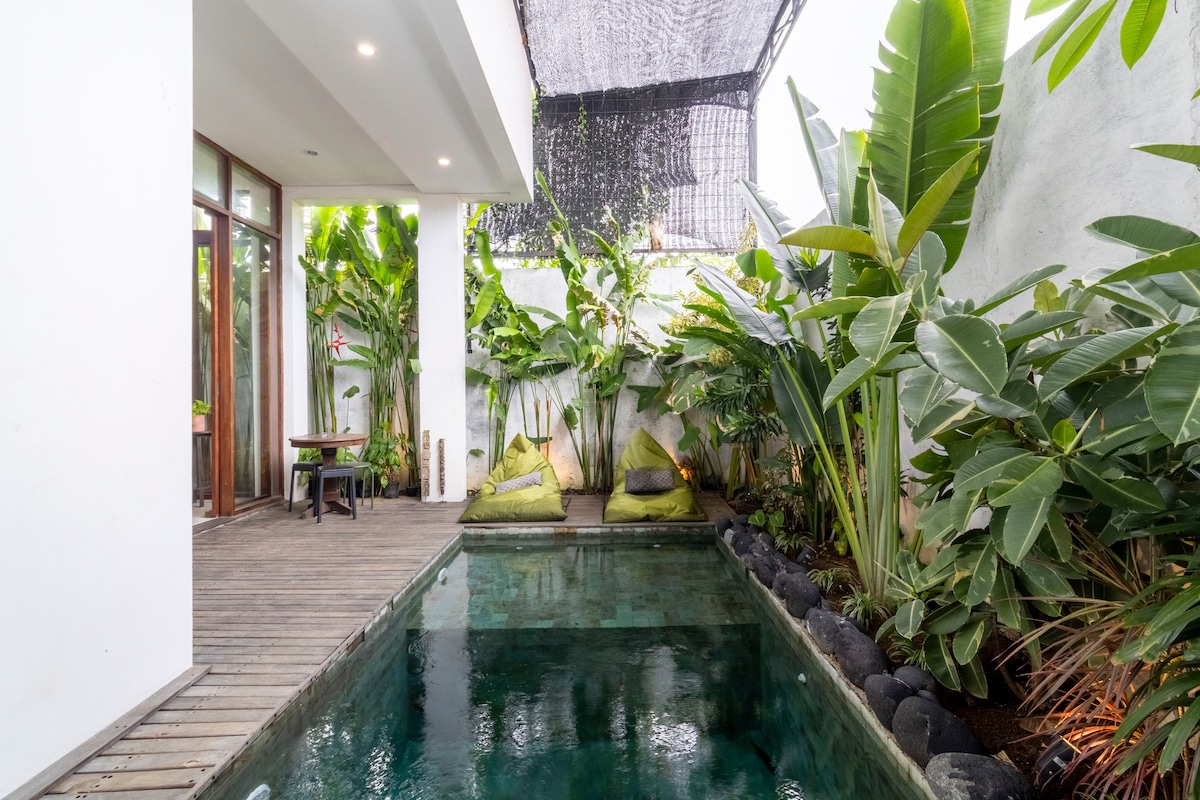 Luh Adi Villa es una moderna casa balinesa de madera que cuenta con una cómoda sala de estar, espacio de trabajo dedicado, cocina privada, baño y un acogedor dormitorio en el altillo. El cenador al aire libre y la piscina compartida ofrecen una agradable experiencia de vida al aire libre. Ubicada en una calle escondida, la villa está a poca distancia de restaurantes, tiendas y mercados tradicionales locales, sin dejar de ofrecer un ambiente tranquilo y relajado. También está convenientemente situado a unos 10-15 minutos en coche de las famosas playas.