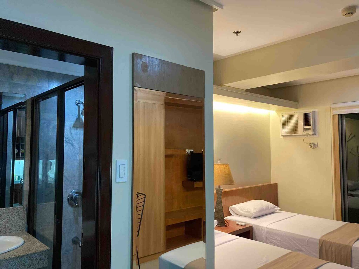Acogedor condominio ubicado en The Bloq Residences, Sikatuna, Ciudad de Cebú.Cerca de Ayala, SM, Robinsons Galleria, Sto Nino, Chong Hua, Cebú Doc. El edificio es de fácil acceso al transporte público. Cuenta con guardias itinerantes las 24 horas. El espacio: -podría alojar a 2 personas. - Tiene aire acondicionado, televisión, ref, ventilador eléctrico, cama doble, wifi PLDT, mesas y sillas, mesas y sillas gratis, dispensador de agua potable gratuita, dispensador de agua caliente y fría, baño con champú y gel de baño/jabón gratuitos. También se proporciona una toalla fresca. Detalles exactos proporcionados al reservar.