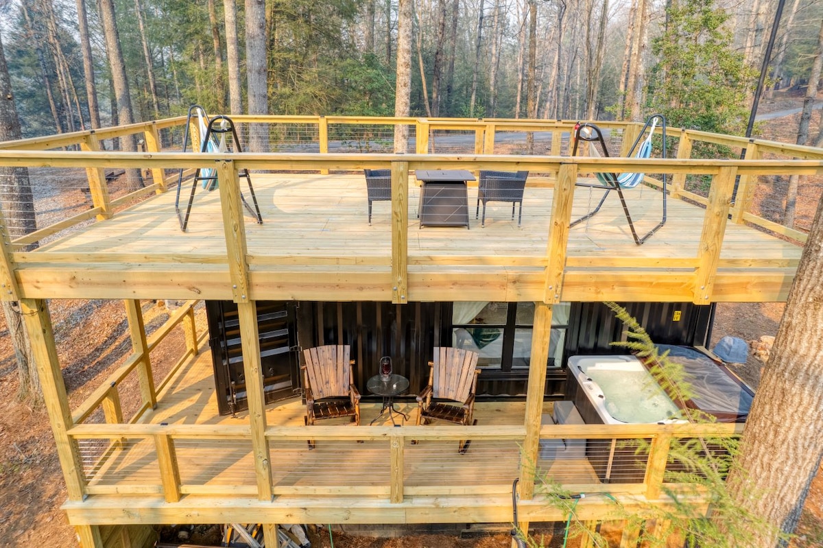 I designed and built this custom shipping container getaway for you to have a unique place to stay, relax and enjoy yourself in the foothills of the North Georgia mountains. This is as close to nature as you can get (without having to go into it, lol). Nestled in a secluded spot minutes away from wineries, tons of outdoor activities and downtown Dahlonega, you'll have something to do for your entire stay! So come relax by the fire pit, in the hot tub, or somewhere on the 1000+ sq. ft. decks.