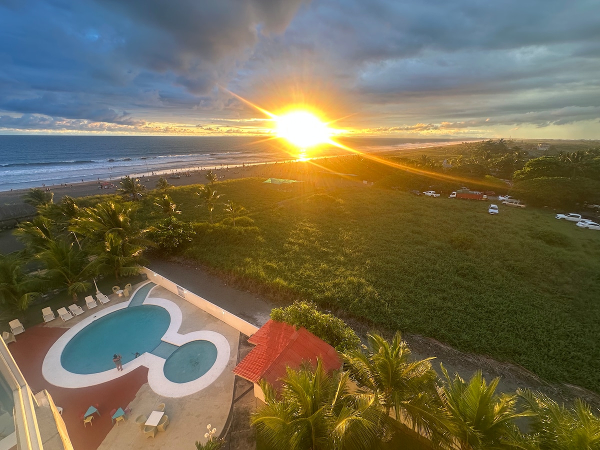 Relájate con toda la familia en este tranquilo lugar para quedarse. Un apartamento a orilla de la playa, ubicado en el segundo piso, con elevador, edificio de 7 pisos. Apartamento con 2 cuartos, con aire acondicionado, un cuarto con cama doble, el otro cuarto con 2 camas individuales y un sofá cama, el apartamento está Cerca de un rancho de comida de marisco. Restaurante Las Olas. A 10 minutos Supermercados y más.Te esperamos