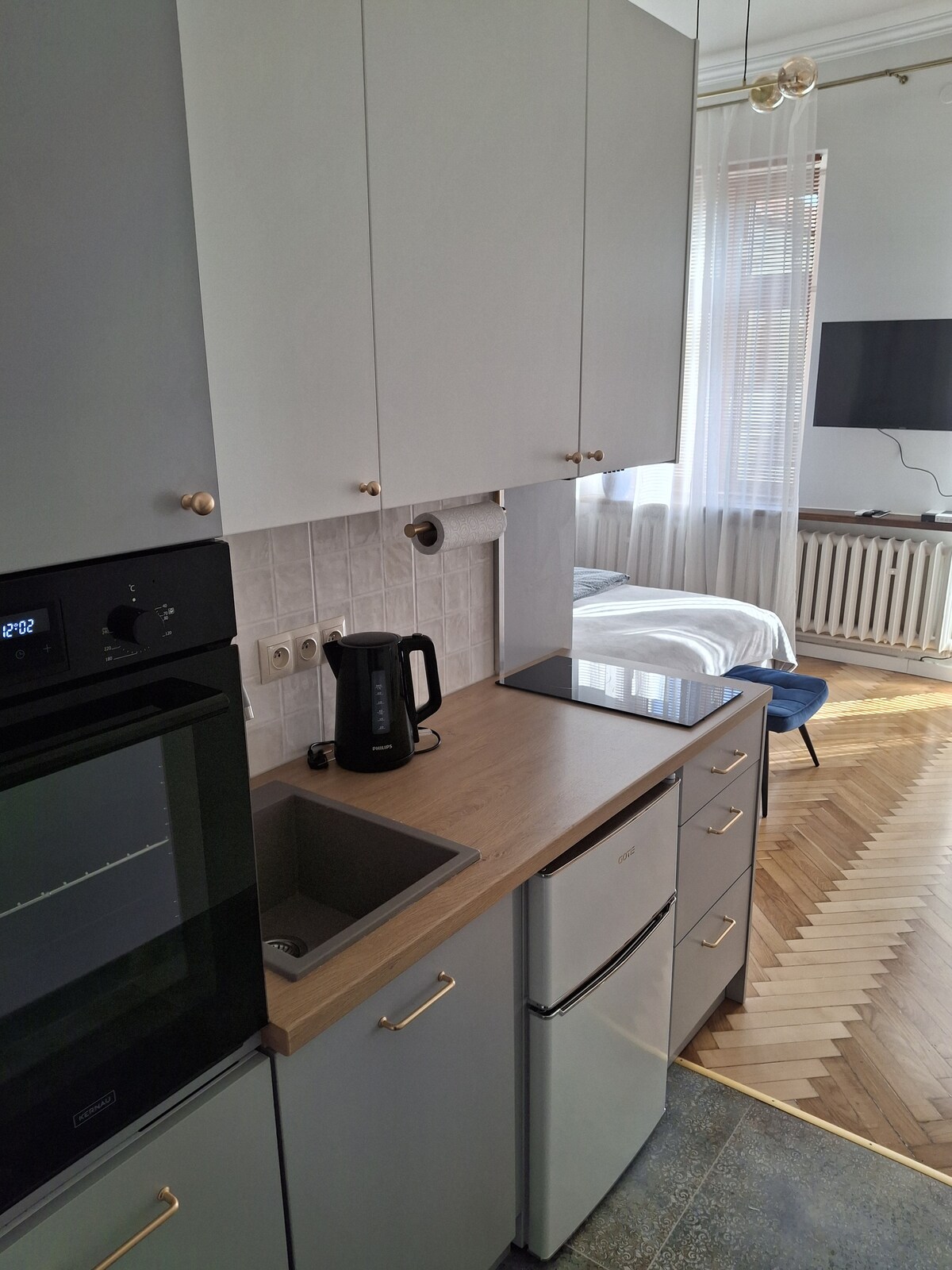 Te invitamos a un apartamento estudio totalmente equipado y acogedor para un máximo de 2 personas. Vista a la plaza del mercado, camas cómodas, wifi, estufa, horno, nevera, espacio de trabajo. Baño con ducha y lavadora. Posible cuna de hasta 3 años.