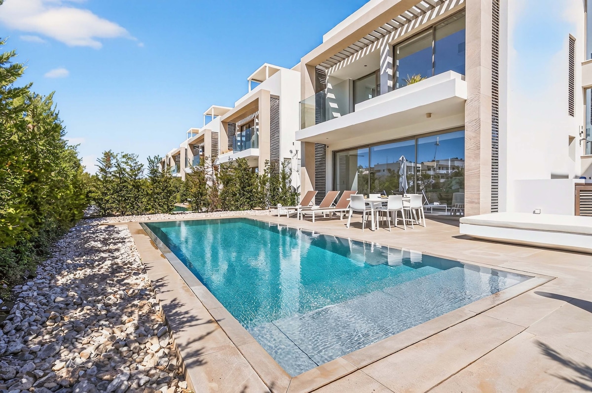 Stunning new 5-bedroom villa with heated pool in central Protaras, perfect for families or groups. This modern home offers an open-plan living area, fully equipped kitchen, and private pool. The first floor has 4 bedrooms / 3 bathrooms. The 5th bedroom with en-suite and private access is located by the pool. Enjoy a roof garden with panoramic views, just steps from Protaras' beaches and attractions.