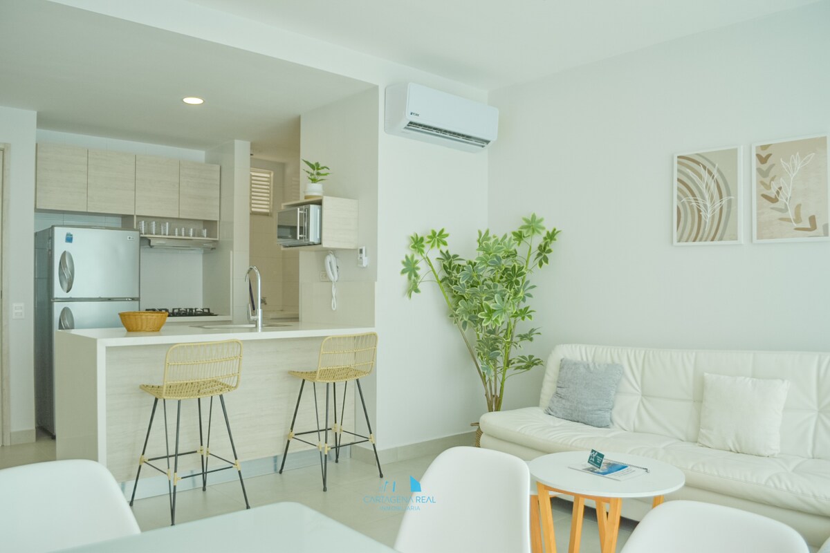 Apartamento moderno con hermosa vista a la laguna 2 habitaciones con 2 baño privado + 1 baño social Agua caliente para relajarte Salida privada a la playa Ubicación ideal: • 5 min del aeropuerto • 15 min del Centro Histórico Restaurantes gourmet y cafés cercanos como Juan Valdez Café Edificio mixto con acceso a servicios del hotel de lujo Faranda Collection Comodidad, ubicación y estilo en un solo lugar. Perfecto para tu estadía en Cartagena. No se permiten visitas, por favor no insista.