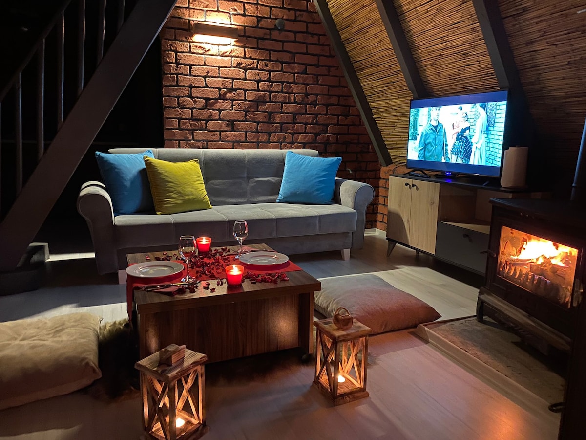 Mudurnuya bagli bir köyün, dag ormaninda ahsaptan yapilmis, etrafinda yalniz orman olan her seyden uzak ama konforlu ve modern dosenmis, harika yuruyusler yaparak ormani kesfetmek icin guvenli ve konforlu bir alan. Hem huzur hem de biraz macera diyorsan bu deneyimi yaşamalısın. Evde bir tercih olarak , gunes paneli ile sinirli elektrik vardir...Işık için mum ışığı, ısınma için şömine, sıcak su için odunlu termosifon kullanıyoruz.