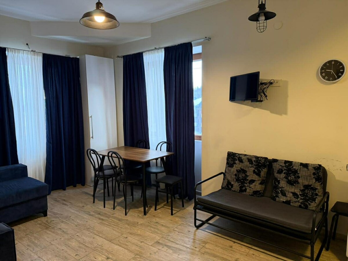 Apartamento ✨ recientemente renovado en el corazón de Borjomi ✨ A solo 10 minutos a pie del famoso parque, situado en la prestigiosa avenida Rustaveli. 🌲 Disfruta de una impresionante vista al bosque, una acogedora sala de estar, un baño moderno y una cocina totalmente equipada. Lavavajillas y lavadora incluidos. 🛏️ 1 dormitorio con una cama tamaño king + 1 dormitorio con 2 camas individuales. 🛒 Tiendas y farmacias cerca. ¡Perfecto para parejas y amigos que valoran la comodidad y la mejor ubicación en Borjomi! 💚 ten en cuenta que el apartamento no tiene ascensor