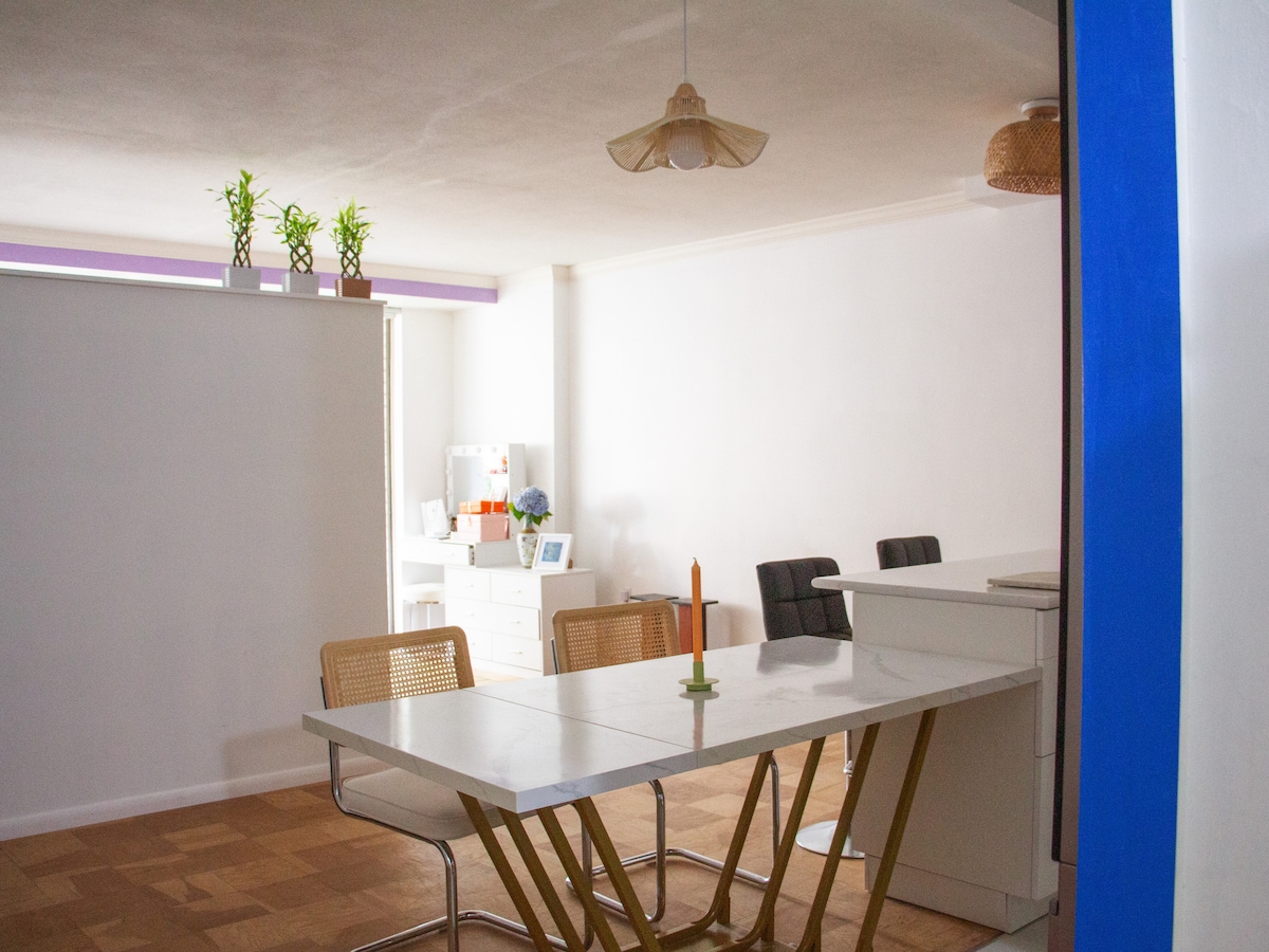 Experimenta Boston en este increíble estudio llamativo. ¡Viene con un divisor de habitación para una sensación de 1 dormitorio! A solo 5 minutos a pie de la T y cerca de Boston College/Harvard, puedes interactuar con todo Boston con buen gusto. Características de la unidad -> Wifi rápido -> TV inteligente de 65 pulgadas con streaming -> Cocina totalmente equipada. -> Lavadora y secadora. -> Cama tamaño queen cómoda Ideal para viajeros de negocios, parejas, enfermeras, aquellos en tratamiento hospitalario y todos los que buscan experimentar Boston con comodidad y paz.