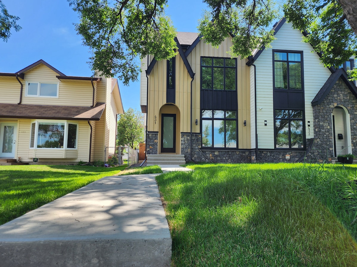 Disfruta del invierno y relájate en este alojamiento tranquilo y elegante. Disfruta de la privacidad de una casa totalmente independiente con vistas al Parque Olímpico de Canadá (Winsport) y a las puestas de sol. Características de lujo que incluyen aire acondicionado central, encimeras de cuarzo, suelos de madera y bañera de aire rejuvenecedor. ¡Ubicado a pocos pasos del río Bow y con acceso rápido a la autopista Transcanadiense (autopista 1) para tus aventuras en la montaña! Incluye garaje privado con calefacción individual y aparcamiento fuera de la calle para tu estancia corta o larga.