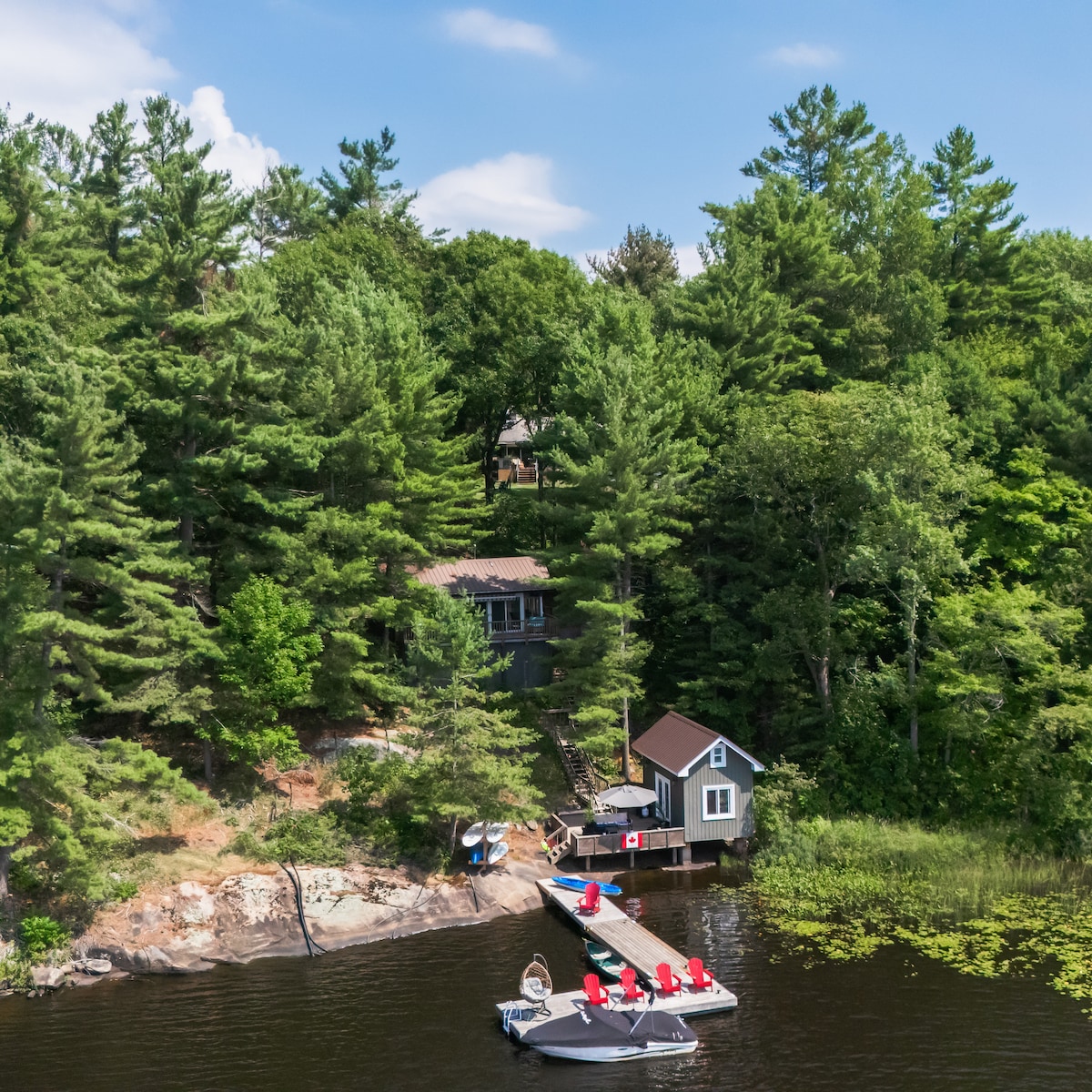 Esta pequeña casa de campo de lujo de 2 dormitorios con loft es perfecta para una escapada romántica en pareja o en familia. Ubicada en 1,5 acres entre majestuosos árboles y afloramientos de granito, crea hermosas vistas desde la terraza con barbacoa, chimenea, jacuzzi o enormes ventanales en toda la casa. La presa de agua y el río al otro lado de la carretera crean relajantes sonidos de cascada que se escuchan desde la cubierta o se disfrutan de cerca desde la cubierta y el muelle privados de la costa. Explora el río Muskoka en kayak, surf de remo o neumáticos de río.