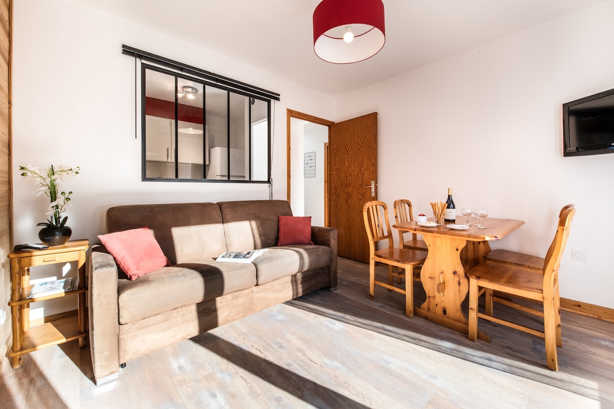 Bonito estudio reformado con una cama doble y 2 literas. 28m² se sentirá cómodo para almacenar el imponente equipo para esquiar. El apartamento está muy bien equipado con material nuevo de buena calidad: aspiradora dyson, TV LG 4 K de 43'' (108 cm), horno, lavavajillas, hervidor de agua, cafetera, tostadora , rasqueta, fundido... El baño está equipado con una ducha y un calentador de toallas. TENGA CUIDADO CON la ropa de cama, toallas y paños de cocina no se proporcionan.