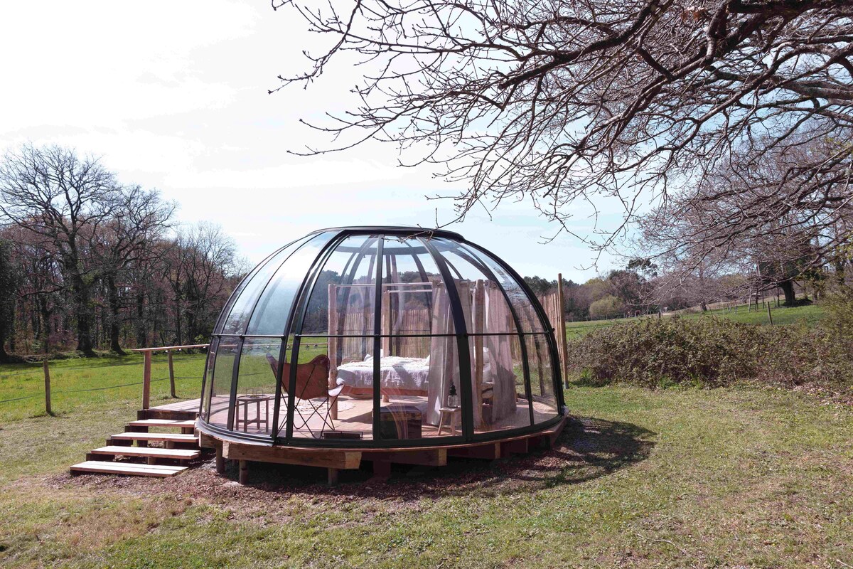 En un entorno verde, vuelve a conectar con lo esencial en una burbuja transparente. ¡Acuéstese para admirar el cielo azul o contemplar las estrellas al caer la noche!Hay libros a su disposición para iniciarse en la astronomía... ¡sumérjase en el mundo de las constelaciones!Te doy la bienvenida a mi jardín bucólico para vivir una experiencia lo más cerca posible de la naturaleza. Déjate cautivar por el canto de los pájaros. (Encuéntrame en Instagram: vous_etes_au_bon_endroit)