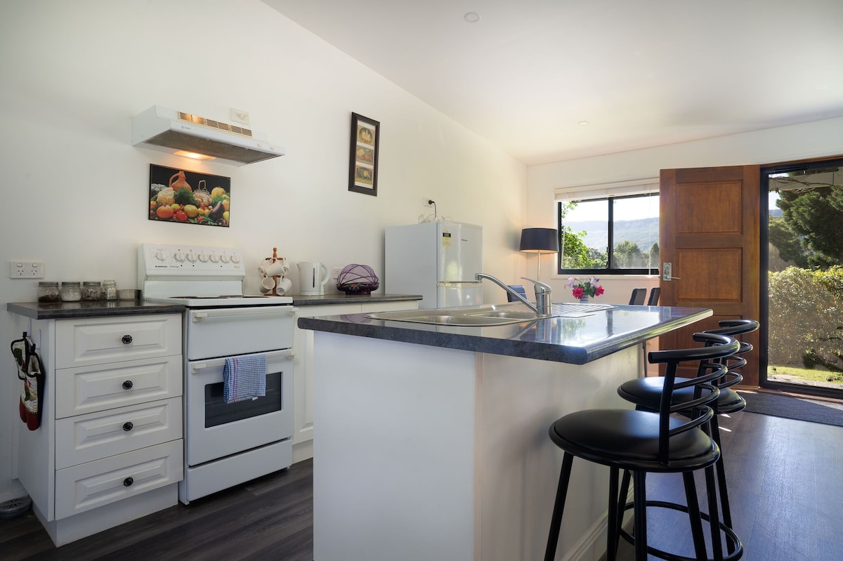 Mountain View Studio es un hermoso espacio independiente con entrada independiente, en la planta baja de nuestra nueva y moderna casa. Con jardín en la parte delantera y tranquilos pastos enfrente, es cómodo y privado. Tiene ventanas del suelo al techo que revelan deliciosas vistas rurales y de montañas distantes, pero está a solo unos minutos del precioso centro de la ciudad de Kiama, playas y delicias costeras. Un sendero para caminar y andar en bicicleta con vistas panorámicas sale de la propiedad.