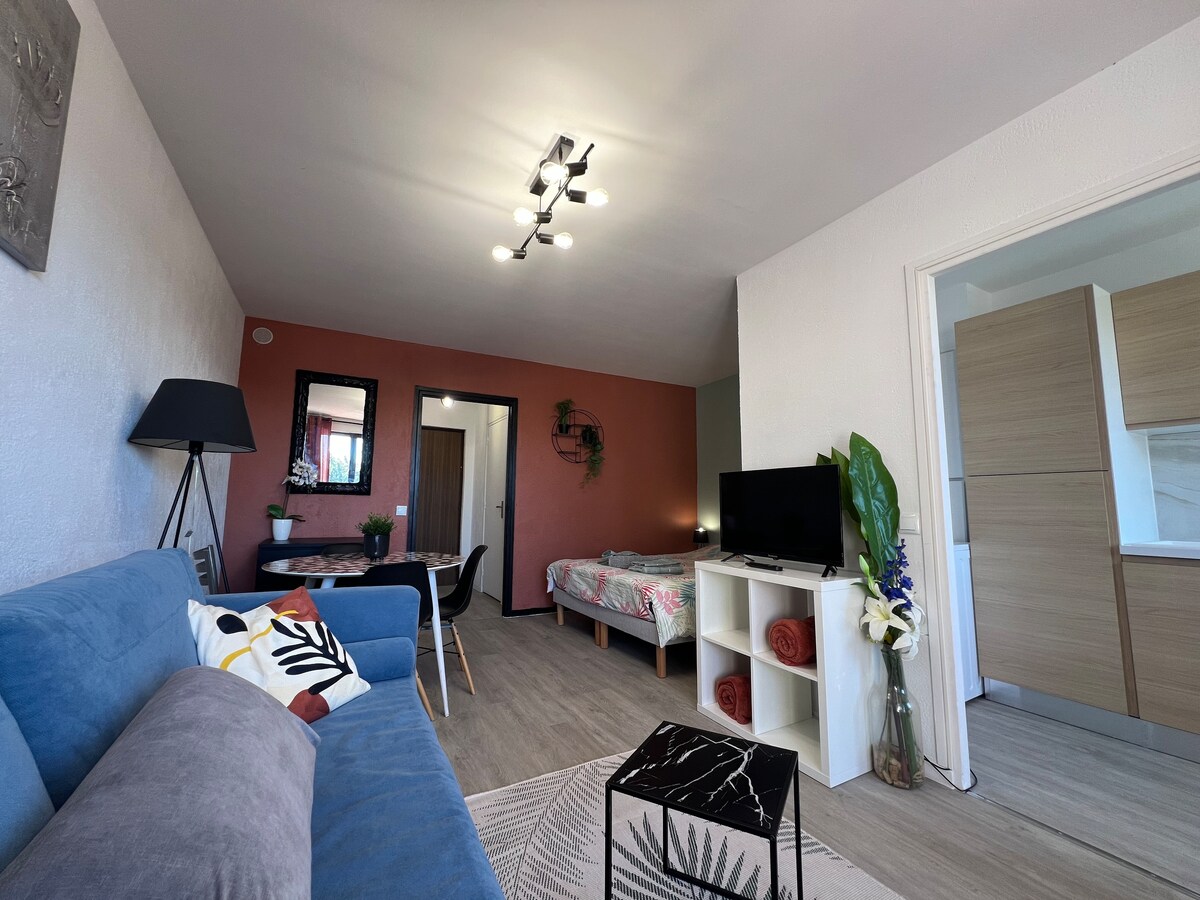 Encantador T1 renovado con plaza de estacionamiento privado en residencia segura. Capacidad 3 pers Ubicación ideal: cerca del centro de la ciudad, transporte, Eurexpo y hospitales. Sala de estar luminosa con sofá cama de 2 plazas (colchón de 20 cm incluido), mesa de comedor, TV conectada, fibra, wifi. Cocina equipada, placa de cocción, cafetera, microondas, nevera y congelador. Una habitación con una cama individual, espacio de trabajo y almacenamiento. Baño con ducha y WC.