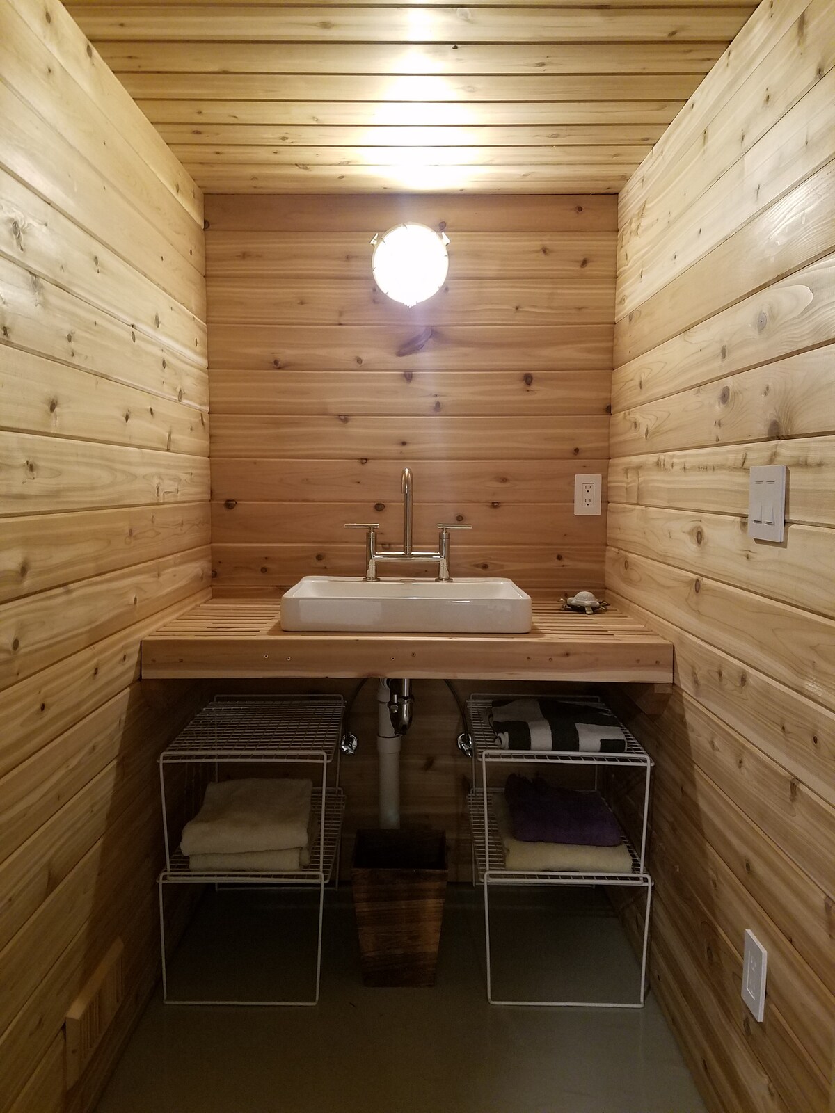 Cabaña minimalista en Bellport con sauna y estufa de leña