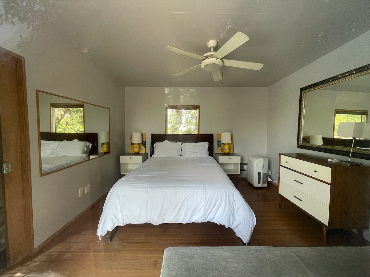 Acogedor apartamento tipo estudio con cama tamaño queen, sala de estar y amplio baño completo. Cocina americana completa con lavandería. Pequeña terraza con preciosas vistas al arroyo. Y esta unidad incluye TV por cable y wifi. Ten en cuenta que hay una tarifa adicional de 75 dólares por estancia para cada mascota. Hay un sofá cama tamaño queen en la sala de estar para invitados por una tarifa adicional de 75 dólares. Esta unidad está unida a la casa principal.