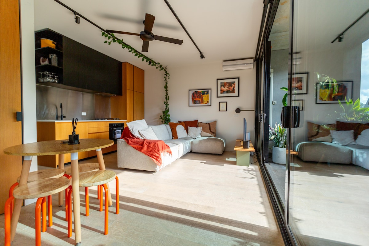 Te damos la bienvenida a Gerty Longroom. Diseñada originalmente por Six Degrees, esta terraza de planta abierta y dos niveles es un escaparate vivo de los artistas y diseñadores que hacen de Gertrude Street un icono global. Encuentra productos de Aesop, cerámica MUD y productos frescos y flores de la granja de Gemima. El dormitorio principal de la planta superior, con cama tamaño king y ropa de cama de lino egipcio, tiene vistas al horizonte y a tu jardín privado de inspiración japonesa con zona de entretenimiento, cabaña y baño a ras de suelo a la sombra de un arce.