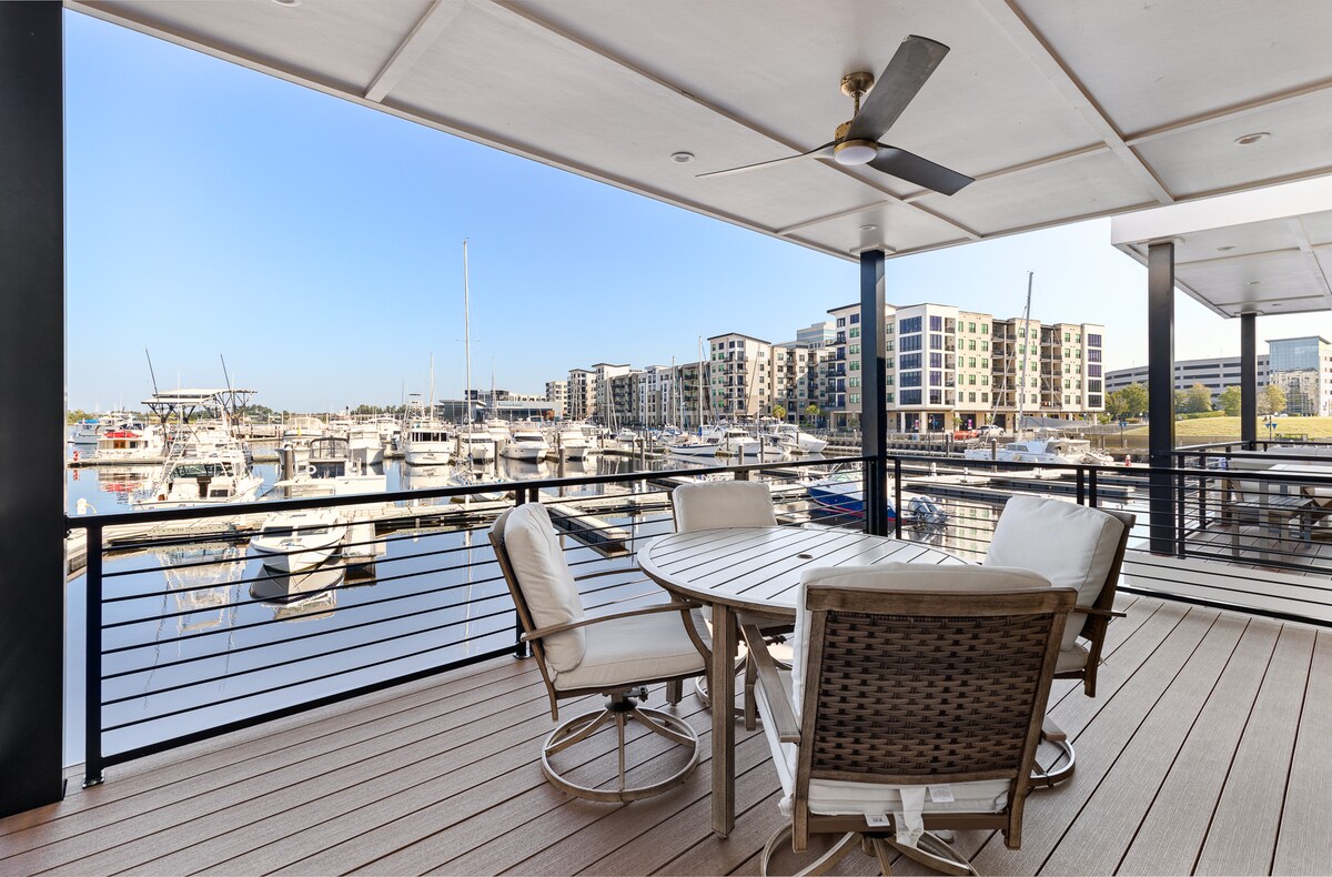 Te damos la bienvenida a “¡La Regencia!“ Vivirás la" dulce vida" en esta casa flotante moderna e impecablemente construida y diseñada que ofrece todos los servicios de un hogar, incluidos dos espacios habitables, una cocina gourmet, dos camas, dos baños, muebles de diseño y una terraza para disfrutar de las puestas de sol en el río Cape Fear. ¡Cerca de todo! Disfrute de un restaurante y un muelle de entretenimiento, donde se celebran conciertos y festivales. Pasea por el paseo fluvial para disfrutar de vistas panorámicas, tiendas, restaurantes y entretenimiento.