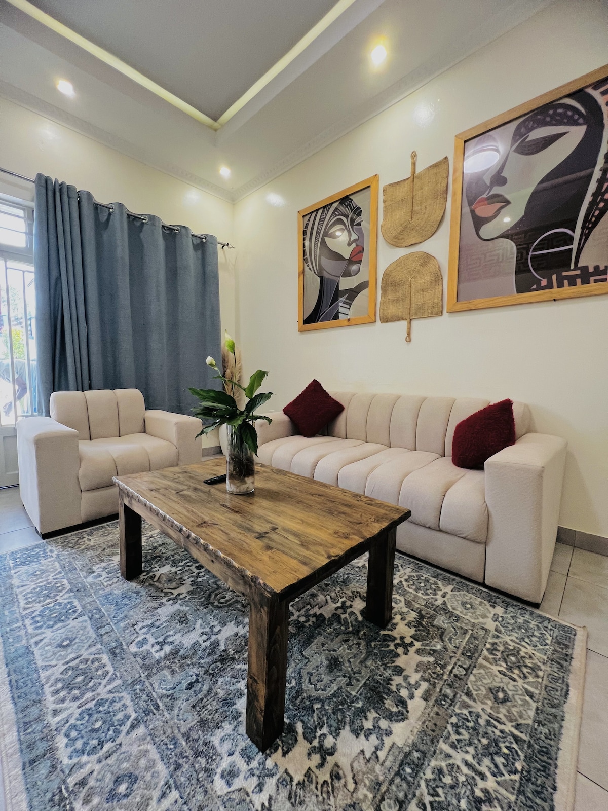 This stylish apartment blends bold colors, curated decor, and unique textures, creating a one-of-a-kind retreat for travelers who love eclectic design. Perfect for those who crave an Airbnb that feels unique, personal, and full of character. A place where African heritage and American style suburban comfort come together in a way that just feels right. A 15-20min drive depending on traffic from the KGL airport located in Kanombe.