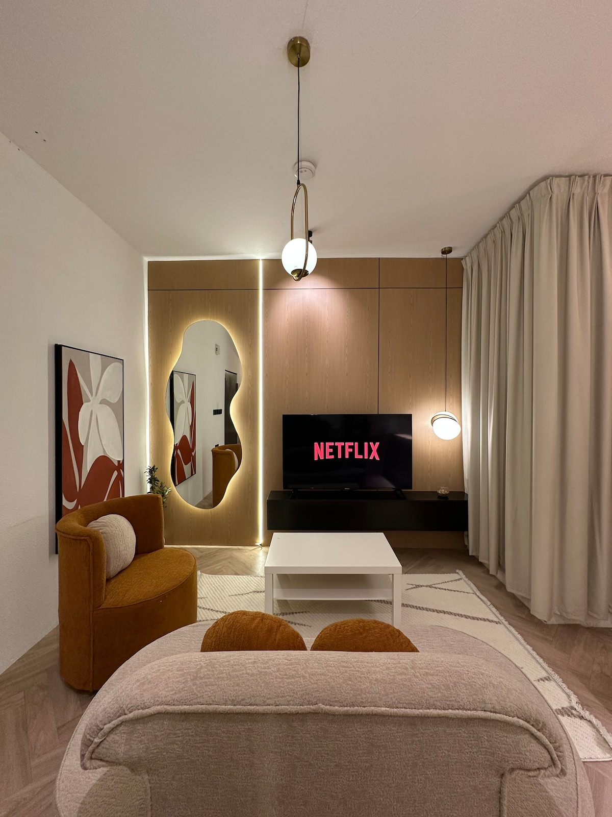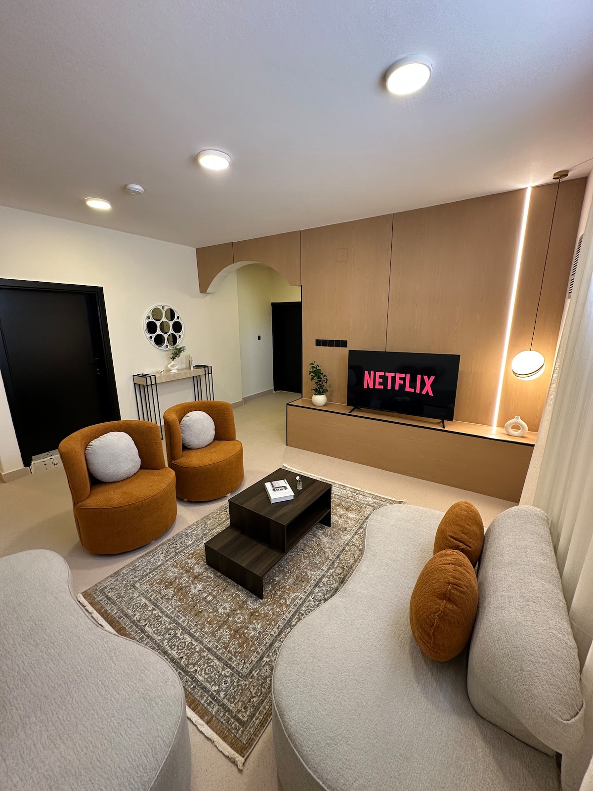 Disfruta de la mezcla perfecta de lujo moderno y comodidad tranquila en un apartamento de hotel con un diseño bohemio cálido y moderno, situado en el barrio de Fayziyah, junto al jardín, a solo unos pasos de distancia. La ubicación también está cerca de todas las necesidades diarias El apartamento está en un hotel moderno con una hermosa entrada y pronto tendrá algunos servicios del hotel como piscina, gimnasio y sección de masajes. Todas las necesidades están disponibles en el apartamento y cuenta con un amplio dormitorio con una cama principal equipada con fieltro y una sala de estar con su hermoso diseño y una pantalla inteligente de 70 pulgadas con Netflix, YouTube y Shahid, hay una sesión de barra lateral