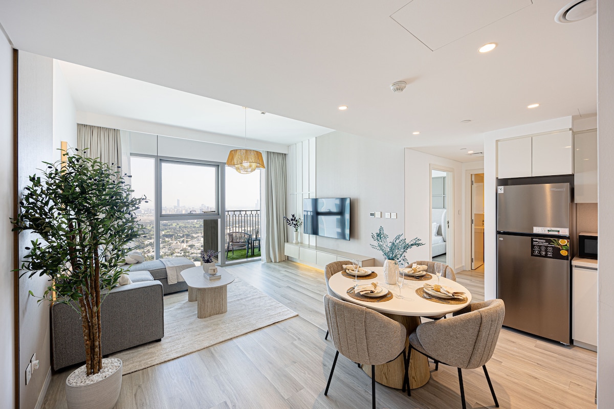 Disfruta del lujo en nuestro apartamento de 2 dormitorios en el lugar más bonito de Dubái, con vistas panorámicas al paisaje urbano del Burj Khalifa y vistas al mar Creek. Relájate y desconecta en esta residencia tranquila y elegante. Aprovecha los servicios de primer nivel del edificio, que incluyen una piscina infinita, gimnasio, zona de juegos para niños, piscina para niños, sala multiusos, cancha de bádminton y cancha de tenis. A ☑️10 minutos del Burj Khalifa, Dubai Mall y SHZ. A ☑️14 minutos de los aeropuertos de Dubái. A ☑️10 minutos de la reserva natural. A ☑️18 minutos de Palm Jumeirah.