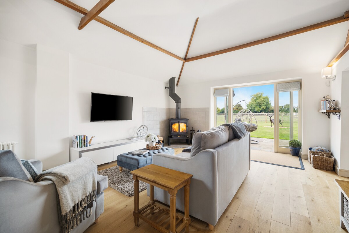 Tómate un descanso y relájate en este espacio rural tranquilo y elegante. Disfruta de pasar tiempo en un entorno de lujo, rodeado de tierras de cultivo y bonitas vistas con todos los servicios de tu hogar. Disfruta de las vistas desde tu cama tamaño king, la gran bañera independiente o el balcón Juliet. Relájate en la gran sala de estar viendo tus películas favoritas en el televisor inteligente de 75 pulgadas, wifi y sonido envolvente. Tienes una cocina equipada con cocina eléctrica con ventilador y 2 fogones para cocinar tus comidas y una mesa de comedor para comerlas.
